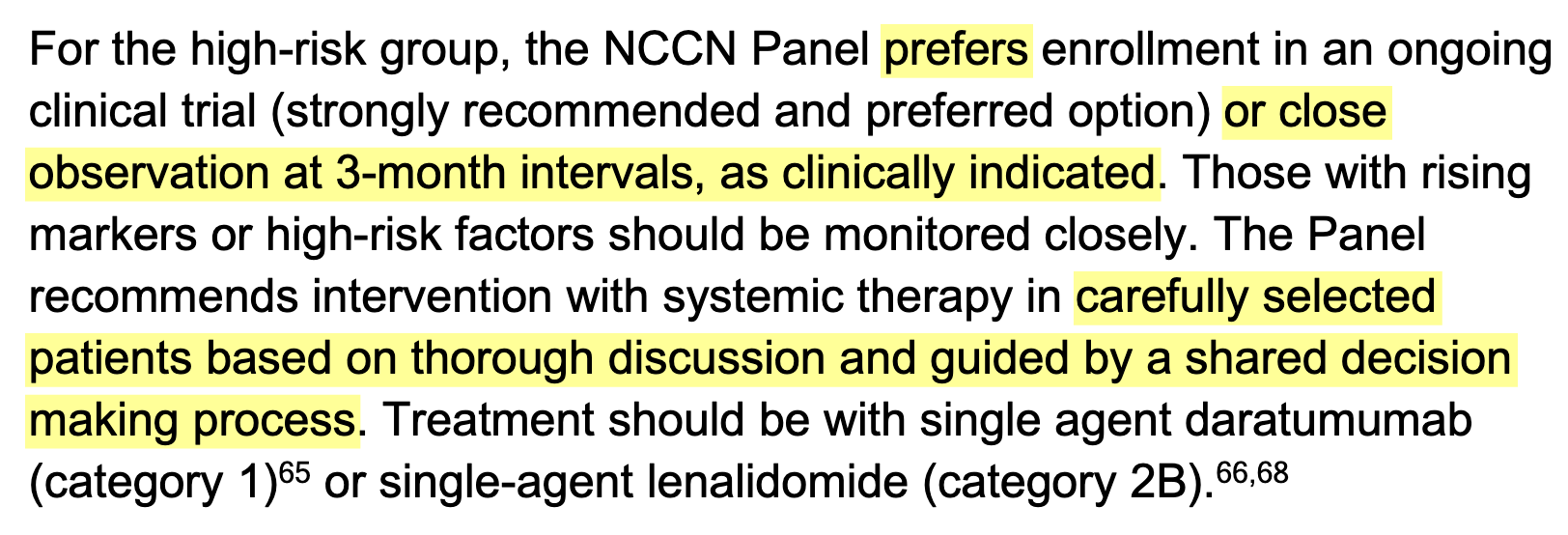 The trial also report an overall survival difference favoring daratumumab (HR = 0.52; 95% CI, 0.27–0.98), and the trial led to the approval by both the FDA and the EMA, and its inclusion as a Category 1 option in the NCCN guidelines for high-risk smoldering myeloma.