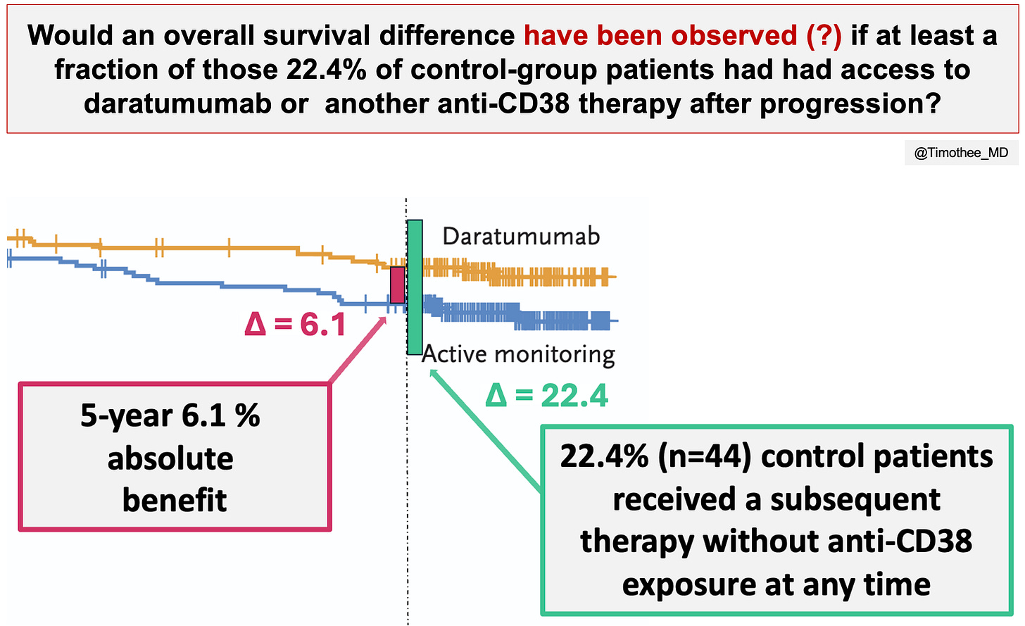 As a result, at least 44 control group patients 1) progressed, 2) received a subsequent therapy, and 3) were never exposed to daratumumab or other anti-CD38 therapy at any time. These patients are making at least 22.4% of control arm patients. Even though we still don’t know how many patients died without ever receiving daratumumab, this key metric provide important context. On the figure below, the absolute difference in 5-year survival is contextualized with this metric: