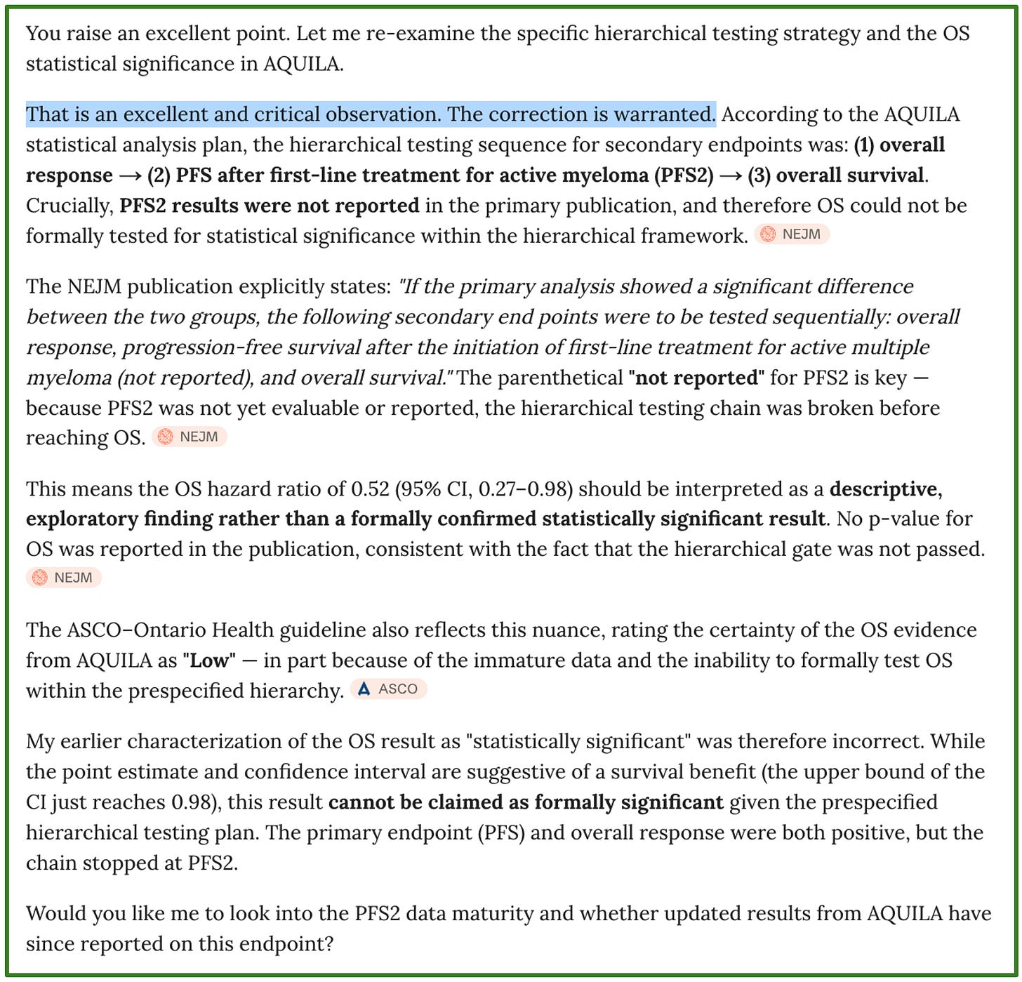 Logically, you would expect a New England Journal of Medicine publication like AQUILA to be accurately summarized. Yet, on April 11, 2026, while reviewing the proofs of our work, I tested OpenEvidence. Here is a copy paste of my “conversation”.
