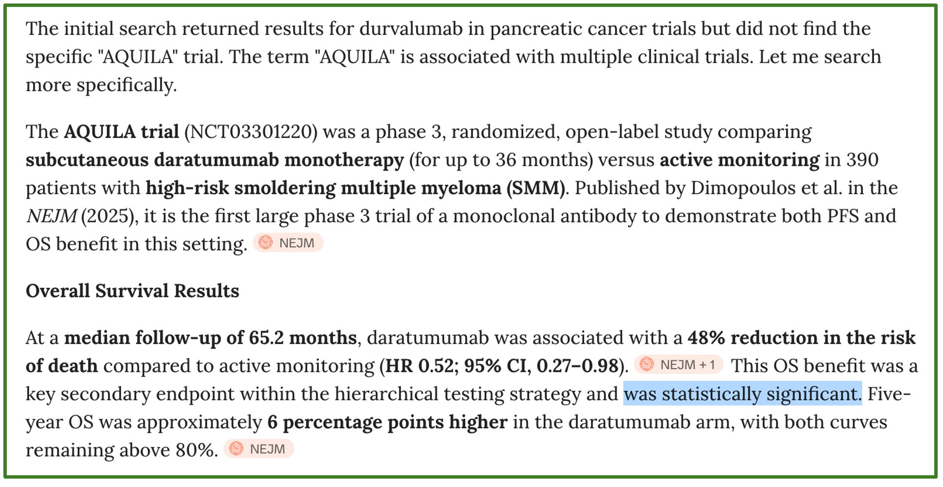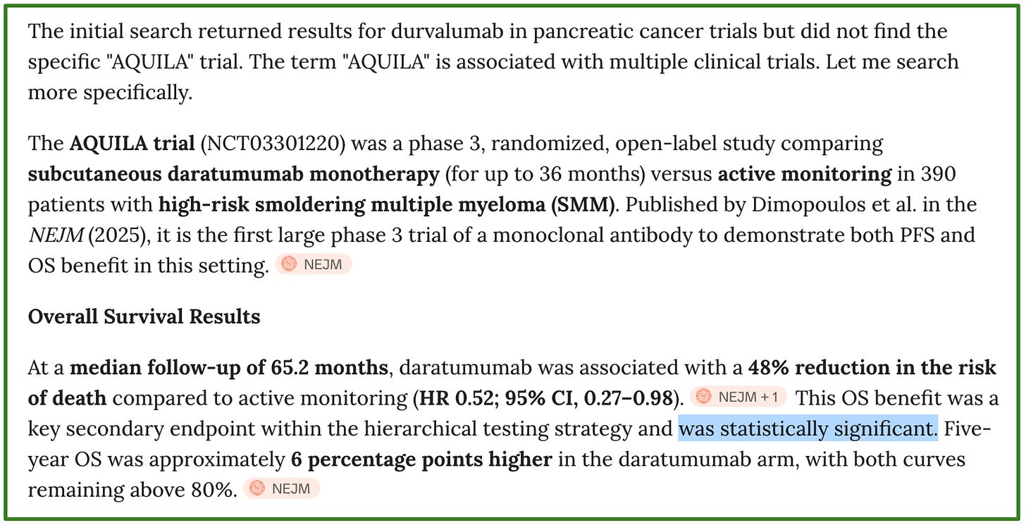 This example is not trivial. Many think OpenEvidence accurately summarizes key data from seminal trials, and here it failed to do so with the survival data from a trial that could affect thousands of patients worldwide. My take: do not be dependent on AI tools. If the computer shuts down, you should still be able to talk to your patients.