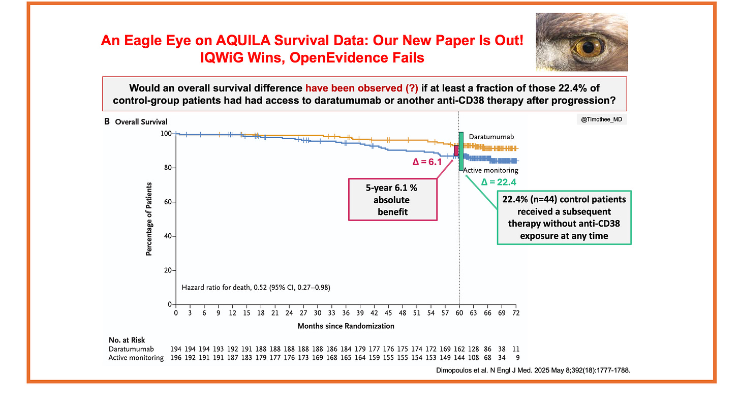 An Eagle Eye on AQUILA Survival Data. Our New Paper Is Out. IQWiG Wins, OpenEvidence Fails.