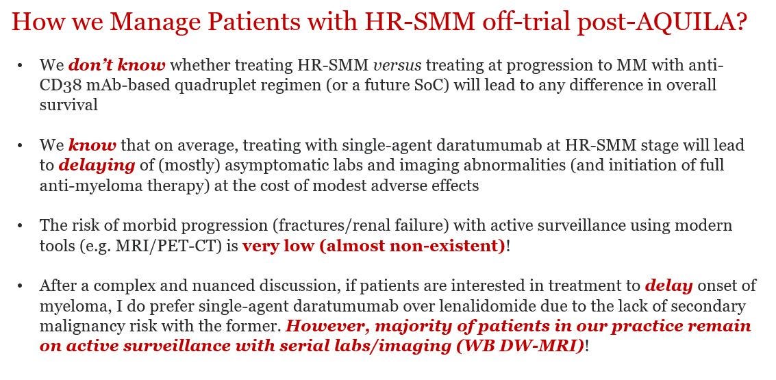also contributed (see below). In the video, he walks us through the definition of smoldering myeloma, including high-risk disease, the seminal trials, and how he approaches this in clinical practice. For those interested in the censoring pattern I mentioned in the video (at 28:27), please go to the BREAKING-ICE App and select AQUILA-OS (with more to come on that in the future).I hope you enjoy the video, including the great Q&A session with Sunny and Milos!