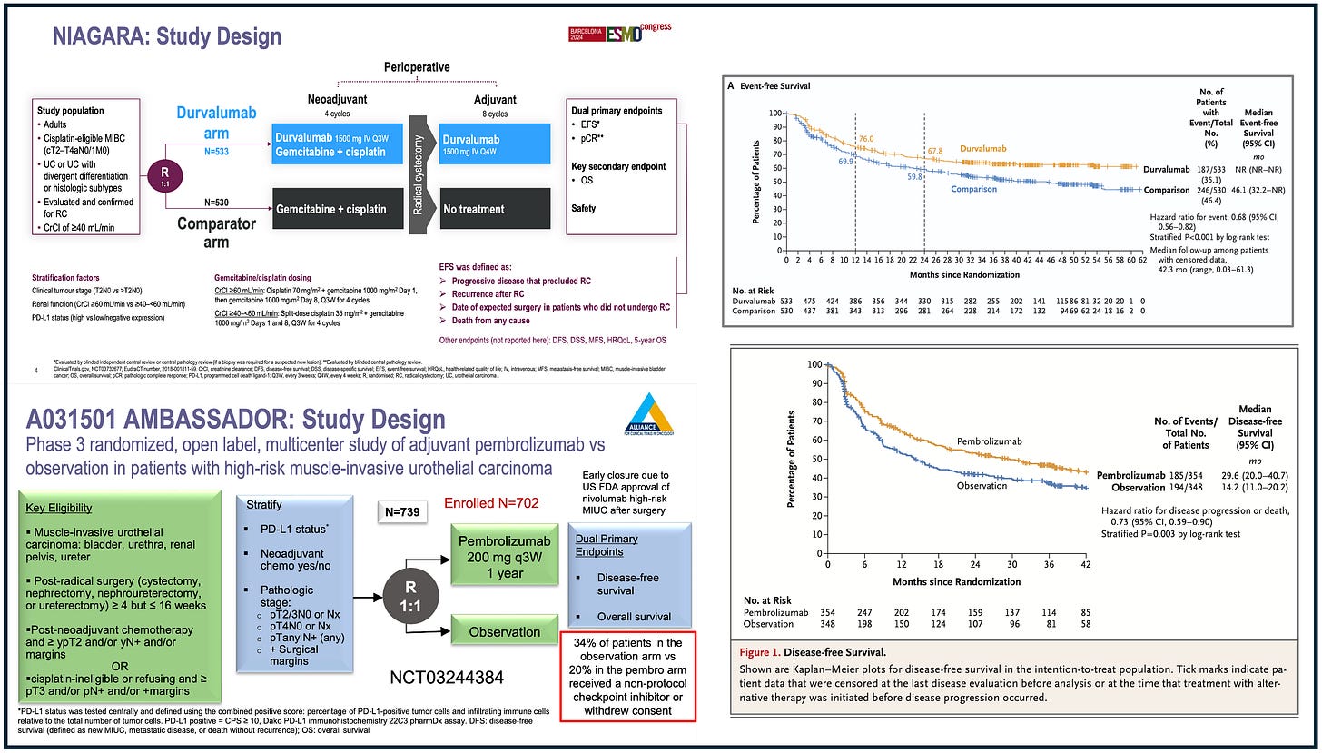 In a previous video, I made a side-by-side comparison between NIAGARA and AMBASSADOR trials (video available here). Both trials were run in the peri-operative setting of bladder cancer (NIAGARA is neo-adjuvant followed by adjuvant, AMBASSADOR is purely adjuvant). Both trials demonstrated an EFS/DFS gain in the experimental arm. Trials’ design (left) and their corresponding EFS/DFS results (right) are shown below: