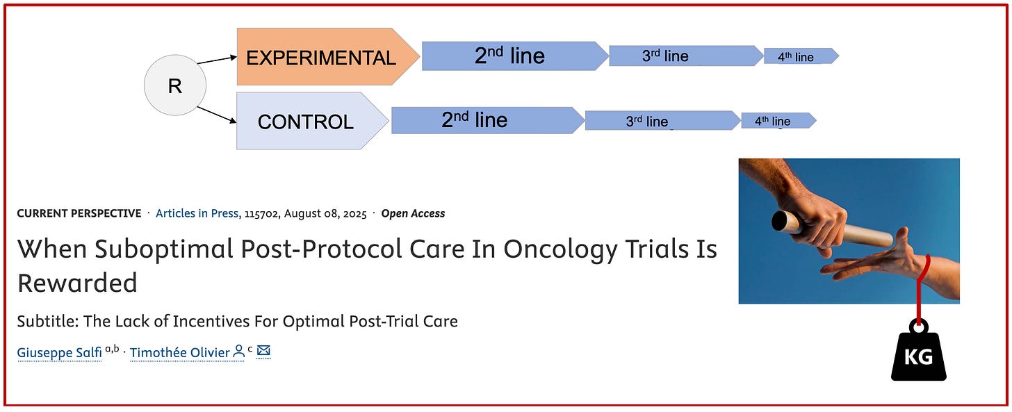 Such limited access is explained when some enrolling countries are simply lacking access to the best care outside the trial. Conversely, in trials like AMBASSADOR, that was exclusively run in the US, optimal access to post-protocol care, which is desirable!, may have explained the absence of survival gain.