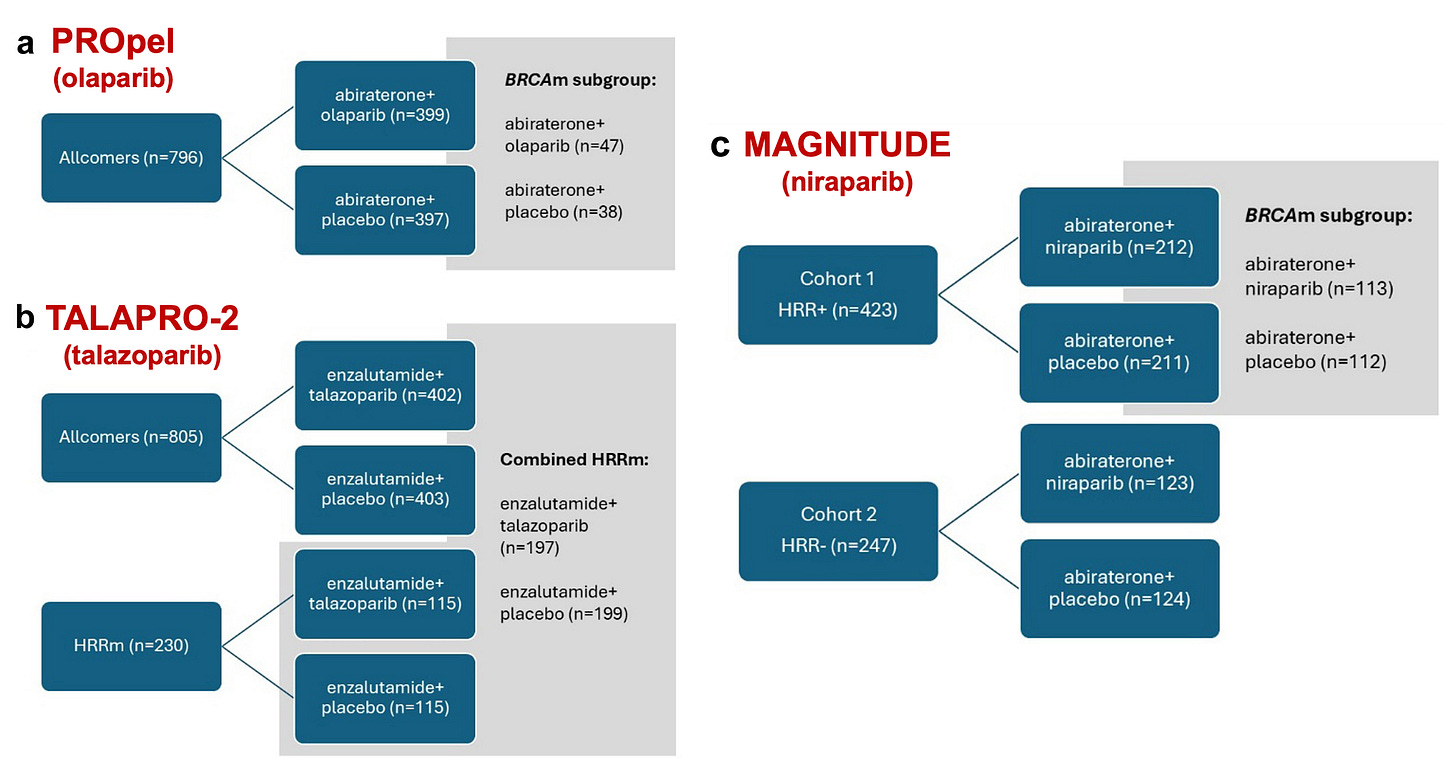 In TALAPRO-2, 805 mCRPC patients were randomly assigned to talazoparib or placebo with enzalutamide. This trial also adopted an all-comer design, albeit with a stratification for HRR mutation. A second cohort of HRRm patients only followed, and the combined HRRm population across both cohorts was analysed.