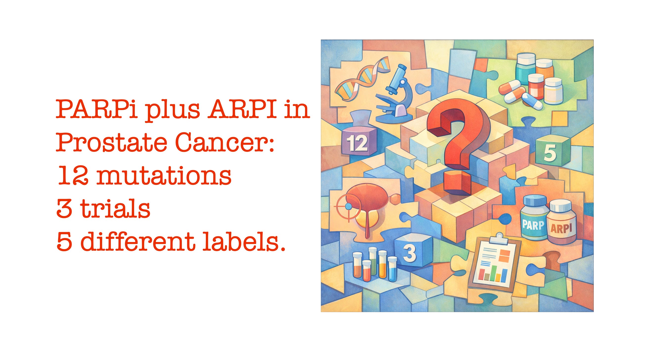 The puzzle of PARP inhibitors plus ARPI in Prostate Cancer: 12 mutations, 3 trials, and 5 different labels.