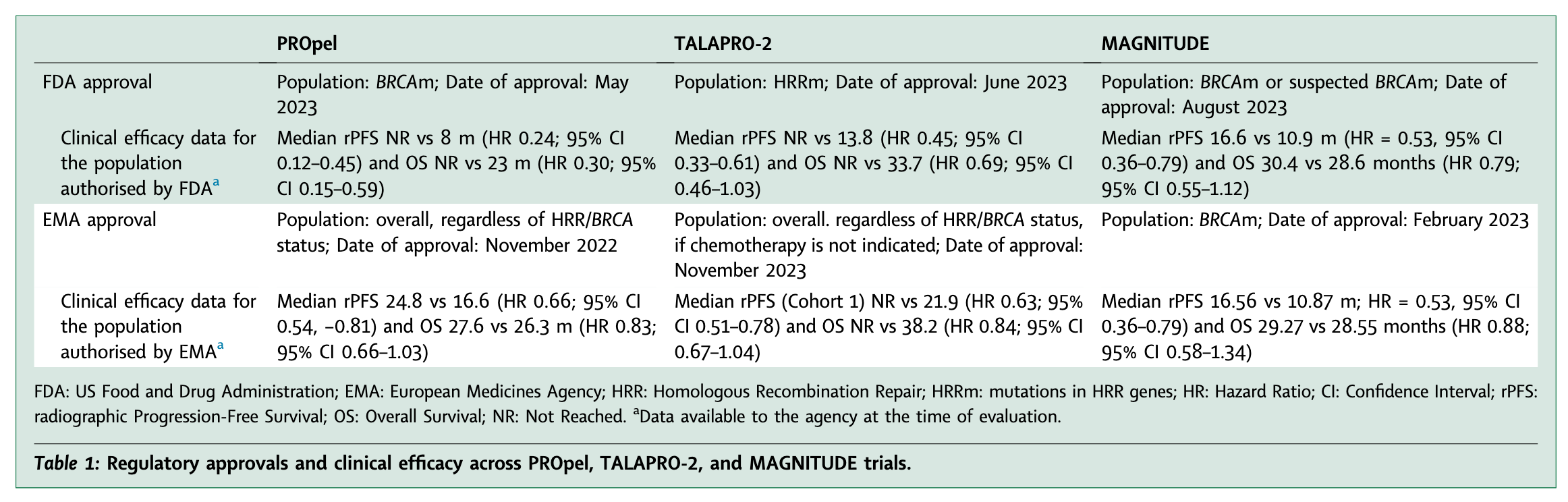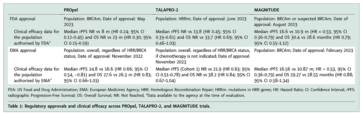 In general, if a positive trial demonstrates benefit in a biomarker-positive subgroup, FDA guidance allows approval only for that population. In contrast, in the case of both PROpel and TALAPRO-2, EMA authorized a broad label for the overall population. (see Table 1 below)